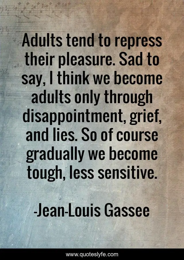 This page presents the quote "Adults tend to repress their pleasure. Sad to say, I think we become adults only through disappointment, grief, and lies. So of course gradually we become tough, less sensitive.". Author of this quote is Jean-Louis Gassee. This quote is about growing-up, observation, adults,.