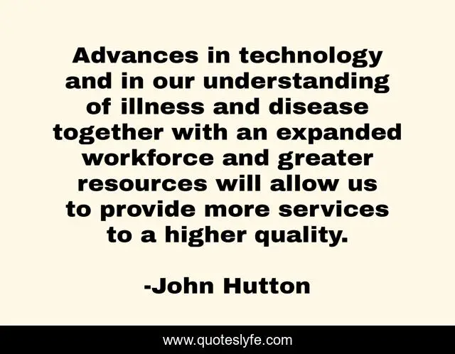 This page presents the quote "Advances in technology and in our understanding of illness and disease together with an expanded workforce and greater resources will allow us to provide more services to a higher quality.". Author of this quote is John Hutton. This quote is about quality, together,.