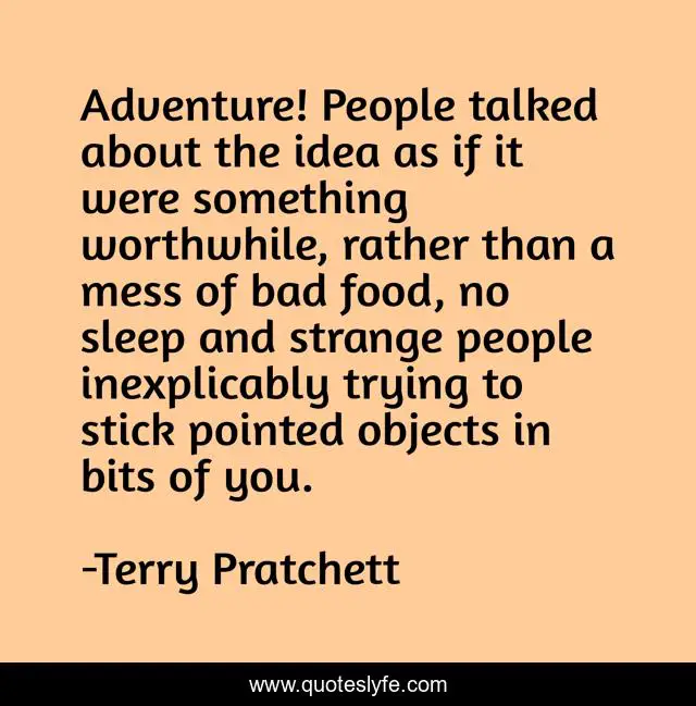 This page presents the quote "Adventure! People talked about the idea as if it were something worthwhile, rather than a mess of bad food, no sleep and strange people inexplicably trying to stick pointed objects in bits of you.". Author of this quote is Terry Pratchett. This quote is about funny, comedy, adventure,.
