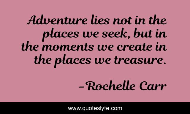 This page presents the quote "Adventure lies not in the places we seek, but in the moments we create in the places we treasure.". Author of this quote is Rochelle Carr. This quote is about quote, rochelle-carr, follow-your-heart-poetry, inspirational, enthusiasm,.
