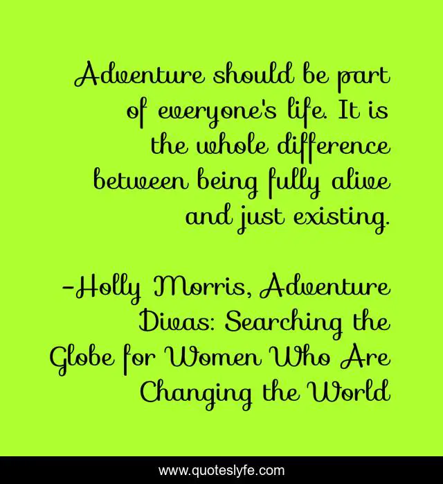 This page presents the quote "Adventure should be part of everyone's life. It is the whole difference between being fully alive and just existing.". Author of this quote is Holly Morris, Adventure Divas: Searching the Globe for Women Who Are Changing the World. This quote is about adventure-divas, travel, pal-bachendri,.