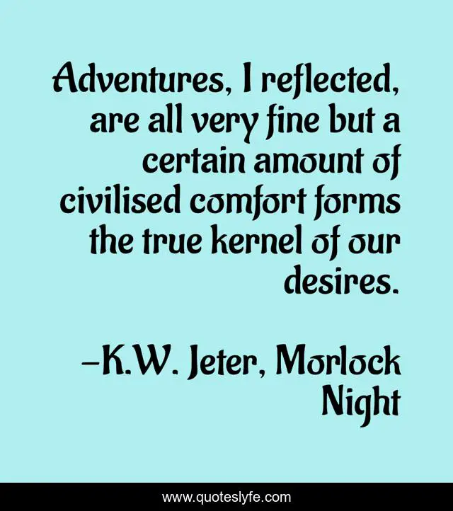 This page presents the quote "Adventures, I reflected, are all very fine but a certain amount of civilised comfort forms the true kernel of our desires.". Author of this quote is K.W. Jeter, Morlock Night. This quote is about morlocks, comfort, adventures, civilsed,.