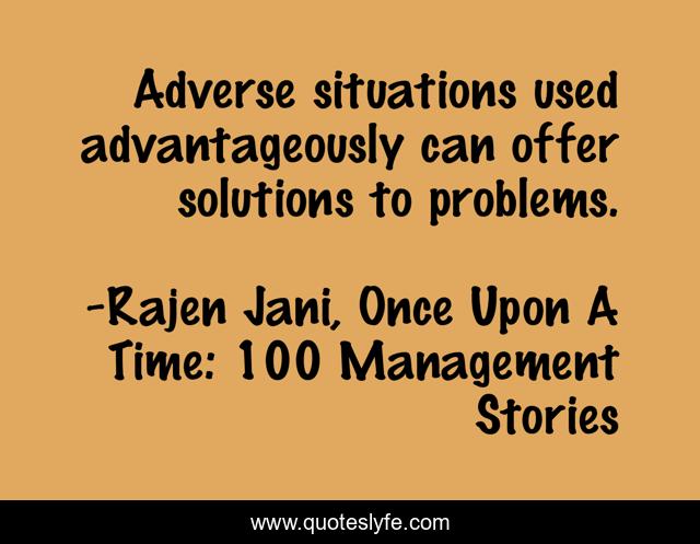This page presents the quote "Adverse situations used advantageously can offer solutions to problems.". Author of this quote is Rajen Jani, Once Upon A Time: 100 Management Stories. This quote is about motivation, communication, sales, anger, improvement, quality, management, knowledge, strategy,.