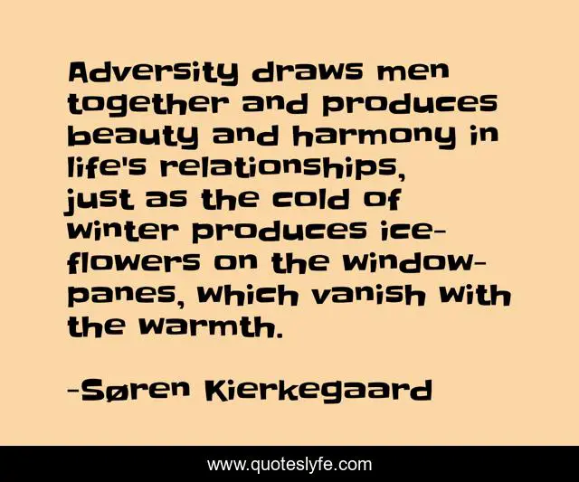 This page presents the quote "Adversity draws men together and produces beauty and harmony in life's relationships, just as the cold of winter produces ice-flowers on the window-panes, which vanish with the warmth.". Author of this quote is Søren Kierkegaard. This quote is about adversity, beauty, harmony,.