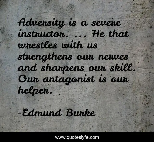 This page presents the quote "Adversity is a severe instructor. ... He that wrestles with us strengthens our nerves and sharpens our skill. Our antagonist is our helper.". Author of this quote is Edmund Burke. .