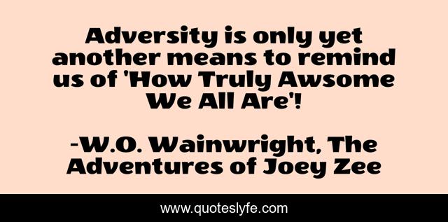 This page presents the quote "Adversity is only yet another means to remind us of 'How Truly Awsome We All Are'!". Author of this quote is W.O. Wainwright, The Adventures of Joey Zee. This quote is about educational, children-s, reaffirming, inspirational, enthusiasm, humane, insightful,.