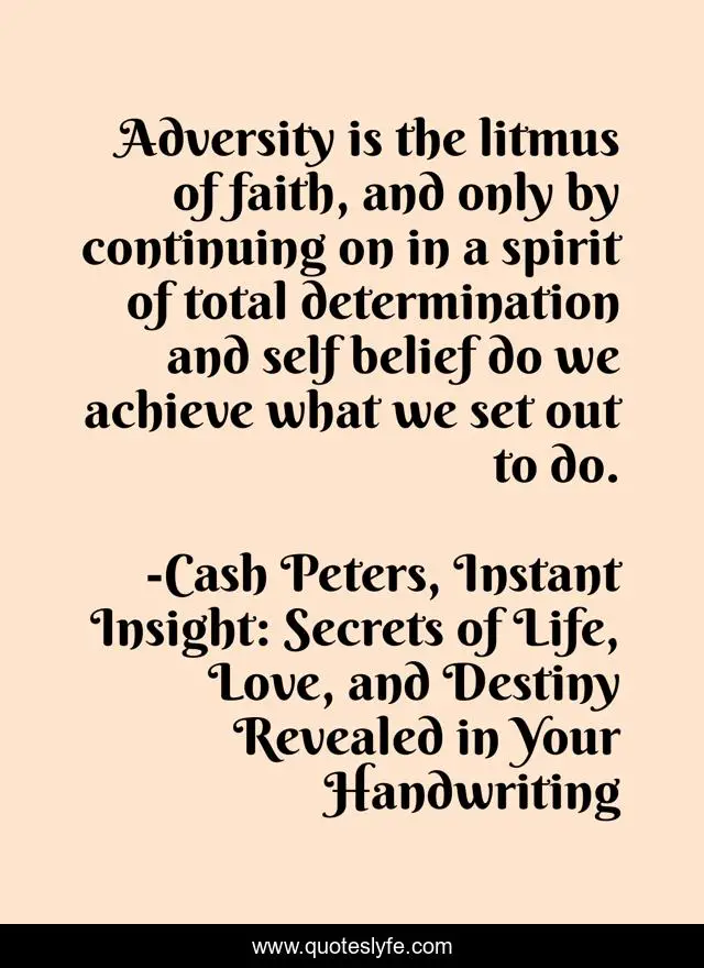 "Cash Peters, Instant Insight: Secrets of Life, Love, and Destiny Revealed in Your Handwriting Quotes." Quoteslyfe.com, 2025. Sat. 06 Dec. 2025. <https://www.quoteslyfe.com/quote/Adversity-is-the-litmus-of-faith-and-203088>.