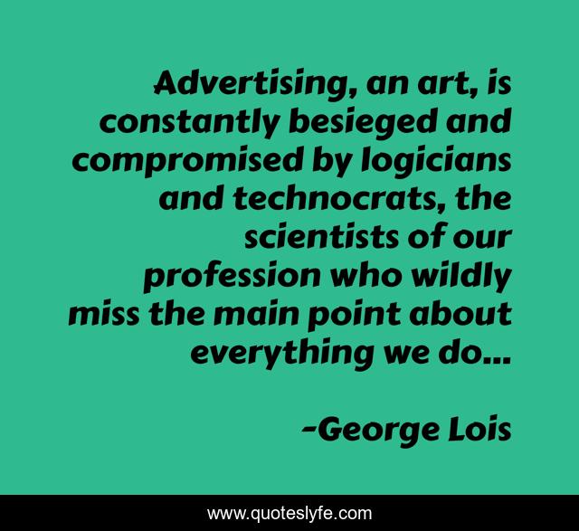 This page presents the quote "Advertising, an art, is constantly besieged and compromised by logicians and technocrats, the scientists of our profession who wildly miss the main point about everything we do…". Author of this quote is George Lois. This quote is about marketing, advertising, branding-expert,.