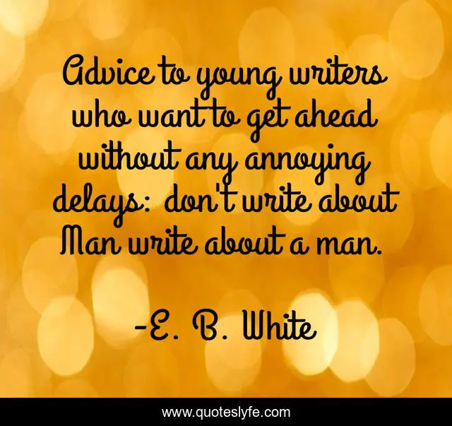 This page presents the quote "Advice to young writers who want to get ahead without any annoying delays: don't write about Man write about a man.". Author of this quote is E. B. White. This quote is about writers, writing,.