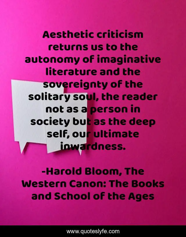 This page presents the quote "Aesthetic criticism returns us to the autonomy of imaginative literature and the sovereignty of the solitary soul, the reader not as a person in society but as the deep self, our ultimate inwardness.". Author of this quote is Harold Bloom, The Western Canon: The Books and School of the Ages. This quote is about aesthetics, humanity, literature, reading,.