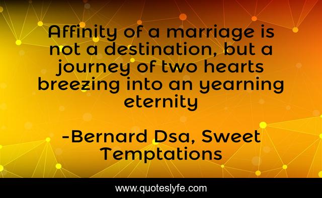 This page presents the quote "Affinity of a marriage is not a destination, but a journey of two hearts breezing into an yearning eternity". Author of this quote is Bernard Dsa, Sweet Temptations. .