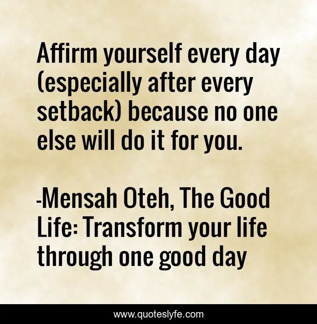 "Mensah Oteh, The Good Life: Transform your life through one good day Quotes." Quoteslyfe.com, 2025. Sun. 14 Dec. 2025. <https://www.quoteslyfe.com/quote/Affirm-yourself-every-day-especially-after-every-48892>.