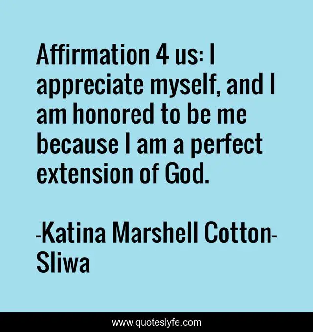 This page presents the quote "Affirmation 4 us: I appreciate myself, and I am honored to be me because I am a perfect extension of God.". Author of this quote is Katina Marshell Cotton-Sliwa. .