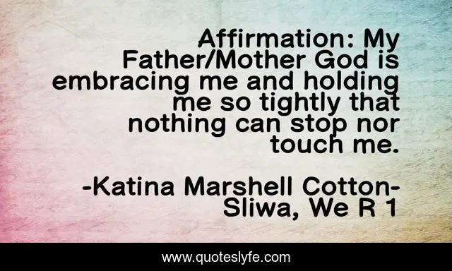This page presents the quote "Affirmation: My Father/Mother God is embracing me and holding me so tightly that nothing can stop nor touch me.". Author of this quote is Katina Marshell Cotton-Sliwa, We R 1. .