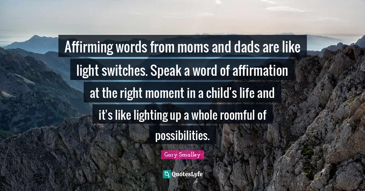 This page presents the quote "Affirming words from moms and dads are like light switches. Speak a word of affirmation at the right moment in a child's life and it's like lighting up a whole roomful of possibilities.". Author of this quote is Gary Smalley. This quote is about light, right moment, dad, life, speak, mom, affirmation, whole, lighting,.