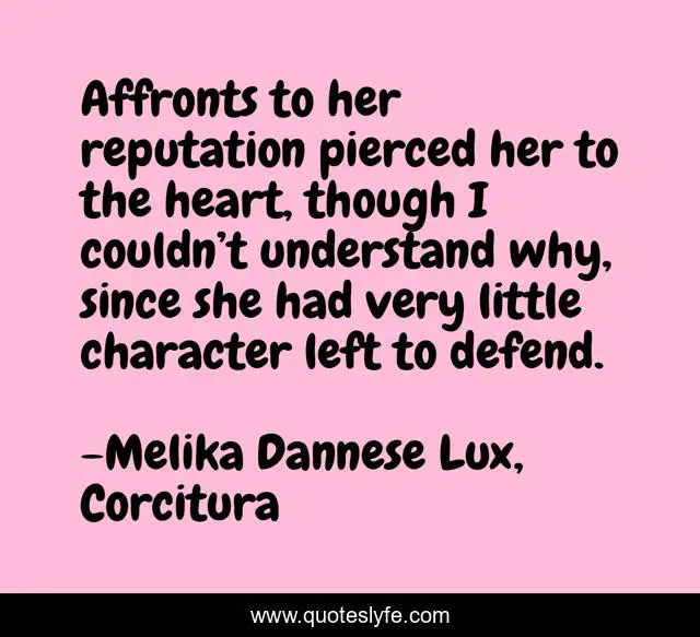 "Melika Dannese Lux, Corcitura Quotes." Quoteslyfe.com, 2025. Mon. 08 Dec. 2025. <https://www.quoteslyfe.com/quote/Affronts-to-her-reputation-pierced-her-to-173865>.