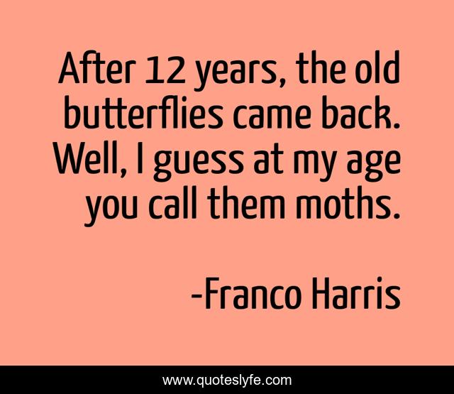This page presents the quote "After 12 years, the old butterflies came back. Well, I guess at my age you call them moths.". Author of this quote is Franco Harris. This quote is about back, years,.