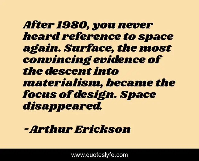 This page presents the quote "After 1980, you never heard reference to space again. Surface, the most convincing evidence of the descent into materialism, became the focus of design. Space disappeared.". Author of this quote is Arthur Erickson. This quote is about art, architecture, materialism,.