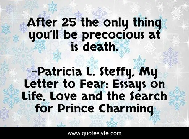 This page presents the quote "After 25 the only thing you’ll be precocious at is death.". Author of this quote is Patricia L. Steffy, My Letter to Fear: Essays on Life, Love and the Search for Prince Charming. This quote is about aging, humor, expectations, women-s-issues, perspective, frustration, self-help,.