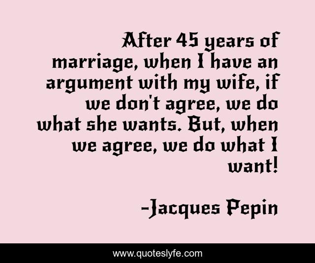 This page presents the quote "After 45 years of marriage, when I have an argument with my wife, if we don't agree, we do what she wants. But, when we agree, we do what I want!". Author of this quote is Jacques Pepin. This quote is about marriage, wife,.