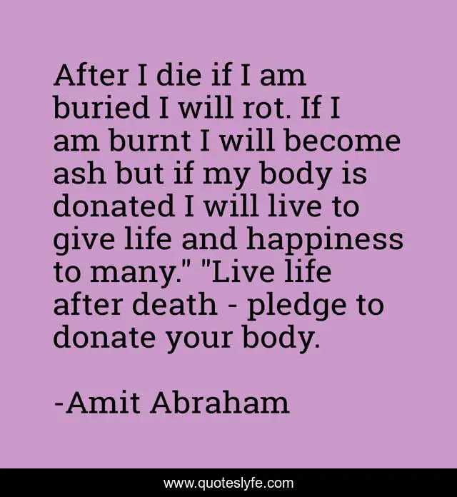 This page presents the quote "After I die if I am buried I will rot. If I am burnt I will become ash but if my body is donated I will live to give life and happiness to many." "Live life after death - pledge to donate your body.". Author of this quote is Amit Abraham. This quote is about organ-donation, life-philosophy, donation, death,.