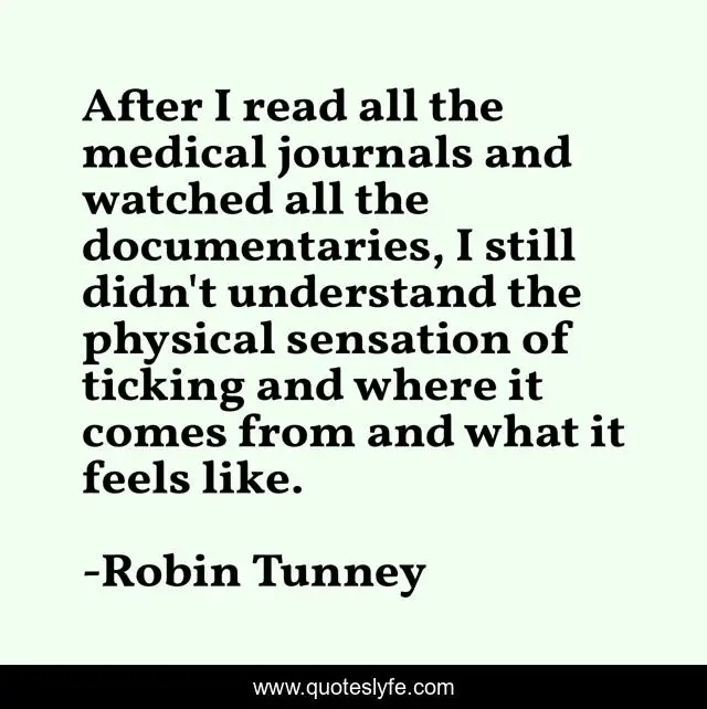This page presents the quote "After I read all the medical journals and watched all the documentaries, I still didn't understand the physical sensation of ticking and where it comes from and what it feels like.". Author of this quote is Robin Tunney. This quote is about understand, like,.