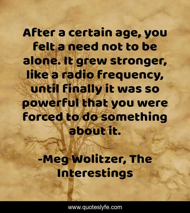 This page presents the quote "After a certain age, you felt a need not to be alone. It grew stronger, like a radio frequency, until finally it was so powerful that you were forced to do something about it.". Author of this quote is Meg Wolitzer, The Interestings. .