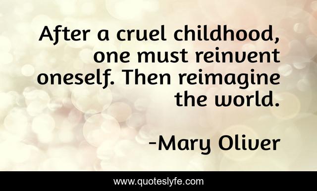 This page presents the quote "After a cruel childhood, one must reinvent oneself. Then reimagine the world.". Author of this quote is Mary Oliver. This quote is about reinvention, rebirth, suffering, childhood-trauma, healing,.