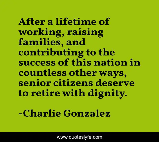 This page presents the quote "After a lifetime of working, raising families, and contributing to the success of this nation in countless other ways, senior citizens deserve to retire with dignity.". Author of this quote is Charlie Gonzalez. This quote is about dignity, senior, working,.