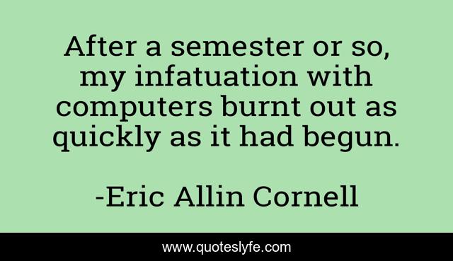 This page presents the quote "After a semester or so, my infatuation with computers burnt out as quickly as it had begun.". Author of this quote is Eric Allin Cornell. This quote is about semester, after, quickly,.