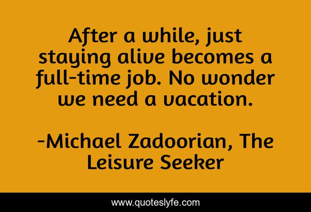 This page presents the quote "After a while, just staying alive becomes a full-time job. No wonder we need a vacation.". Author of this quote is Michael Zadoorian, The Leisure Seeker. This quote is about staying-alive, aging, vacation,.
