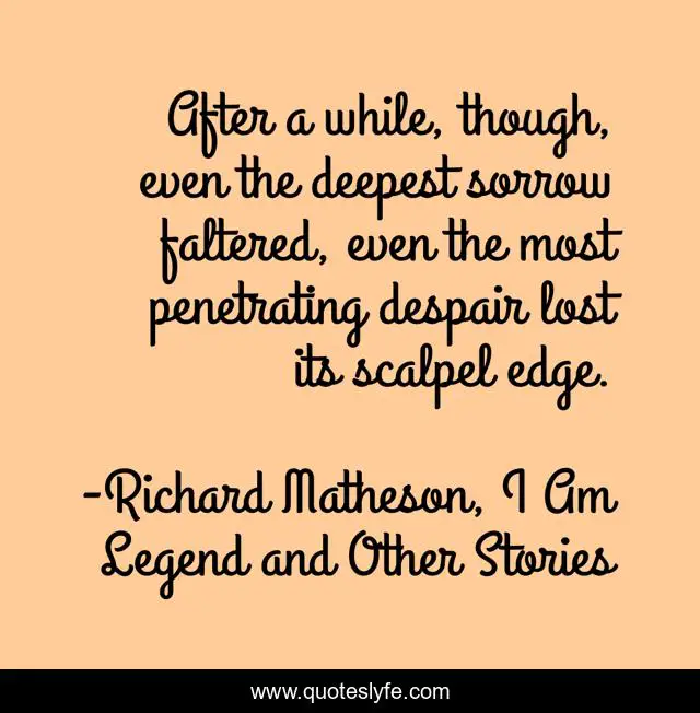 This page presents the quote "After a while, though, even the deepest sorrow faltered, even the most penetrating despair lost its scalpel edge.". Author of this quote is Richard Matheson, I Am Legend and Other Stories. .