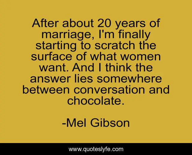 This page presents the quote "After about 20 years of marriage, I'm finally starting to scratch the surface of what women want. And I think the answer lies somewhere between conversation and chocolate.". Author of this quote is Mel Gibson. This quote is about marriage, women,.