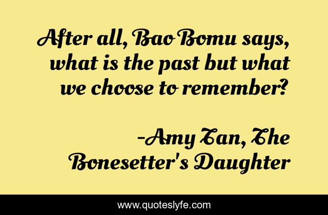 This page presents the quote "After all, Bao Bomu says, what is the past but what we choose to remember?". Author of this quote is Amy Tan, The Bonesetter's Daughter. This quote is about past, memory,.