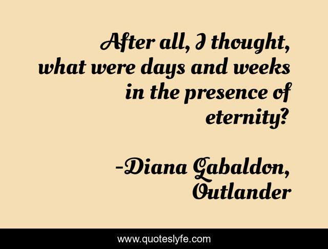 This page presents the quote "After all, I thought, what were days and weeks in the presence of eternity?". Author of this quote is Diana Gabaldon, Outlander. This quote is about eternity, weeks, days,.