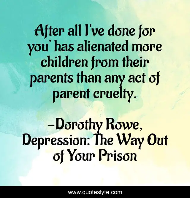 This page presents the quote "After all I've done for you' has alienated more children from their parents than any act of parent cruelty.". Author of this quote is Dorothy Rowe, Depression: The Way Out of Your Prison. This quote is about psychology, child, abuse, self-help, children, depression,.