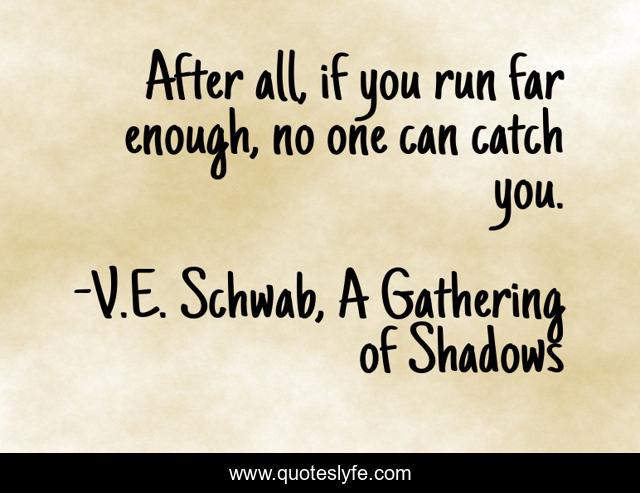 This page presents the quote "After all, if you run far enough, no one can catch you.". Author of this quote is V.E. Schwab, A Gathering of Shadows. This quote is about freedom, life, running, choices,.
