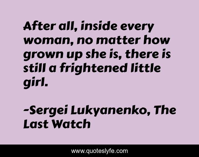 This page presents the quote "After all, inside every woman, no matter how grown up she is, there is still a frightened little girl.". Author of this quote is Sergei Lukyanenko, The Last Watch. This quote is about little-girl, fear, woman, inside,.