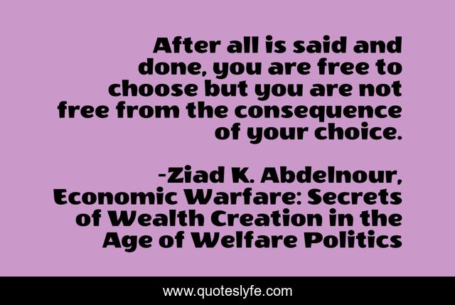 This page presents the quote "After all is said and done, you are free to choose but you are not free from the consequence of your choice.". Author of this quote is Ziad K. Abdelnour, Economic Warfare: Secrets of Wealth Creation in the Age of Welfare Politics. This quote is about consequence, choose, free, choice,.