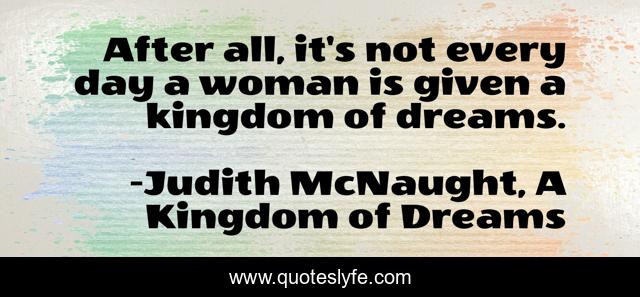 This page presents the quote "After all, it's not every day a woman is given a kingdom of dreams.". Author of this quote is Judith McNaught, A Kingdom of Dreams. This quote is about kingdom, given, woman, dream,.
