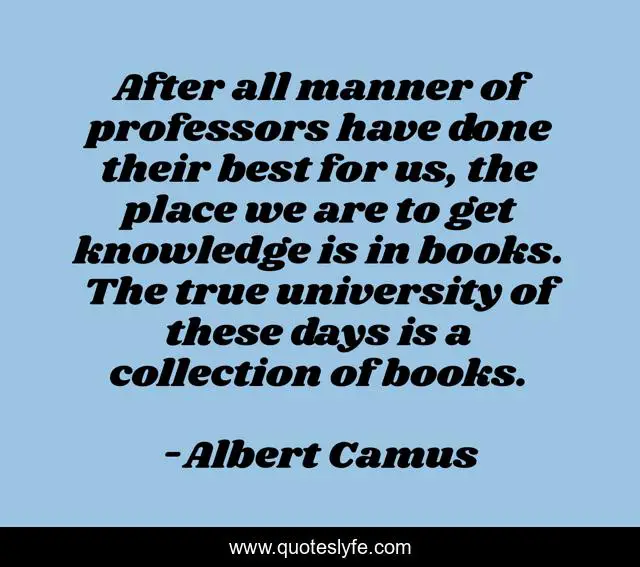 This page presents the quote "After all manner of professors have done their best for us, the place we are to get knowledge is in books. The true university of these days is a collection of books.". Author of this quote is Albert Camus. This quote is about place, knowledge, best,.