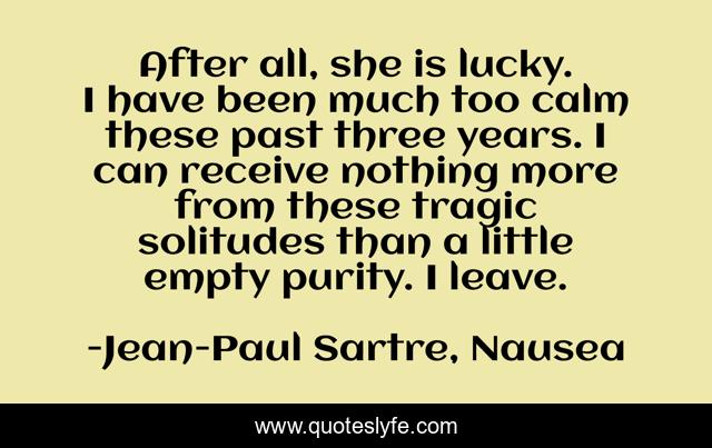 This page presents the quote "After all, she is lucky. I have been much too calm these past three years. I can receive nothing more from these tragic solitudes than a little empty purity. I leave.". Author of this quote is Jean-Paul Sartre, Nausea. This quote is about jean-paul, solitude, purity, sartre,.