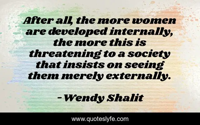 This page presents the quote "After all, the more women are developed internally, the more this is threatening to a society that insists on seeing them merely externally.". Author of this quote is Wendy Shalit. This quote is about feminism, women,.