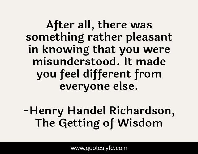 This page presents the quote "After all, there was something rather pleasant in knowing that you were misunderstood. It made you feel different from everyone else.". Author of this quote is Henry Handel Richardson, The Getting of Wisdom. This quote is about angst, adolescence, humour, misunderstood,.