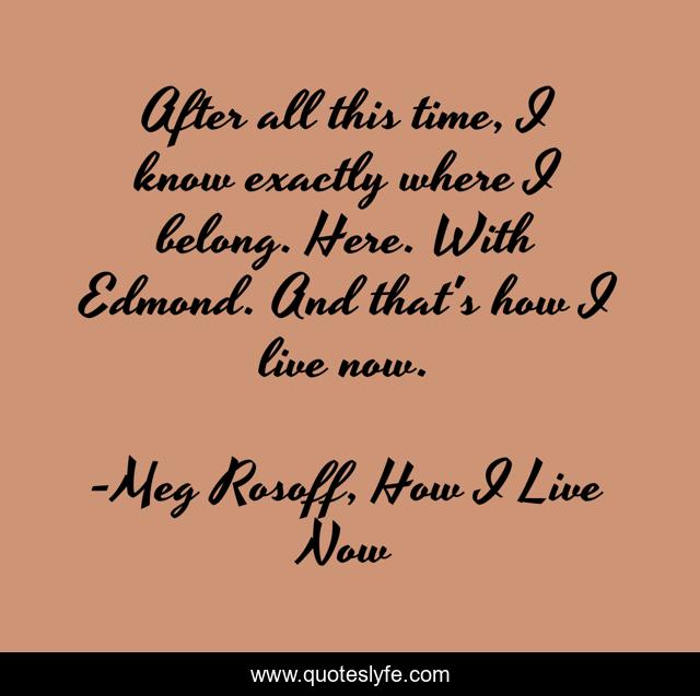 This page presents the quote "After all this time, I know exactly where I belong. Here. With Edmond. And that's how I live now.". Author of this quote is Meg Rosoff, How I Live Now. This quote is about dystopian, love, teenagers, affection,.