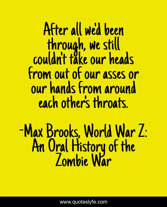 This page presents the quote "After all we'd been through, we still couldn't take our heads from out of our asses or our hands from around each other's throats.". Author of this quote is Max Brooks, World War Z: An Oral History of the Zombie War. This quote is about blame, pride,.