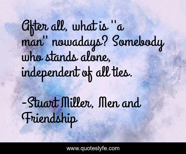This page presents the quote "After all, what is ''a man'' nowadays? Somebody who stands alone, independent of all ties.". Author of this quote is Stuart Miller, Men and Friendship. .