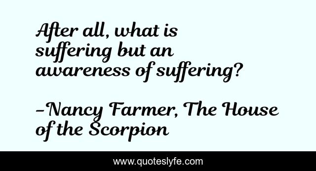 This page presents the quote "After all, what is suffering but an awareness of suffering?". Author of this quote is Nancy Farmer, The House of the Scorpion. This quote is about suffering, pain, awareness,.