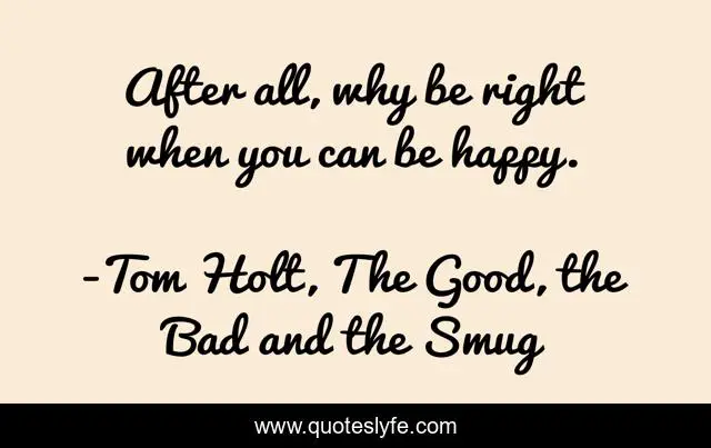 This page presents the quote "After all, why be right when you can be happy.". Author of this quote is Tom Holt, The Good, the Bad and the Smug. .