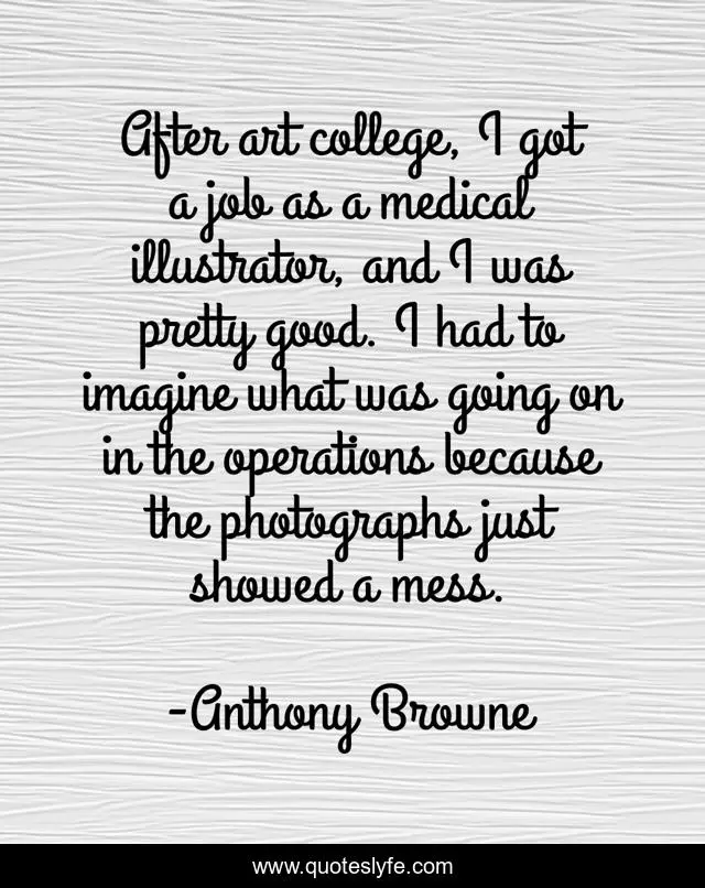 This page presents the quote "After art college, I got a job as a medical illustrator, and I was pretty good. I had to imagine what was going on in the operations because the photographs just showed a mess.". Author of this quote is Anthony Browne. This quote is about art, good, college,.